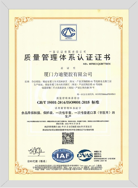 廈門力迪塑膠有限公司,成立于2005年是一家產業鏈完整、已有專業研發設計團隊、生產、銷售及品牌運營為一體的現代化企業。公司主營:一次性餐飲耗品與一次性醫療耗品;具體產品有:一次性PE手套、保鮮袋、保鮮膜、環保垃圾袋、纏繞膜、PS航空杯、紙杯、錫紙以及醫用防護口罩,醫用外科口罩,醫用創可貼,醫用敷貼,醫用手套等一次性耗品。車間按照國家“QS標準化進行規劃設計,運營面積達35000+平方米,擁有專業生產線400余條,月產量3900余噸。